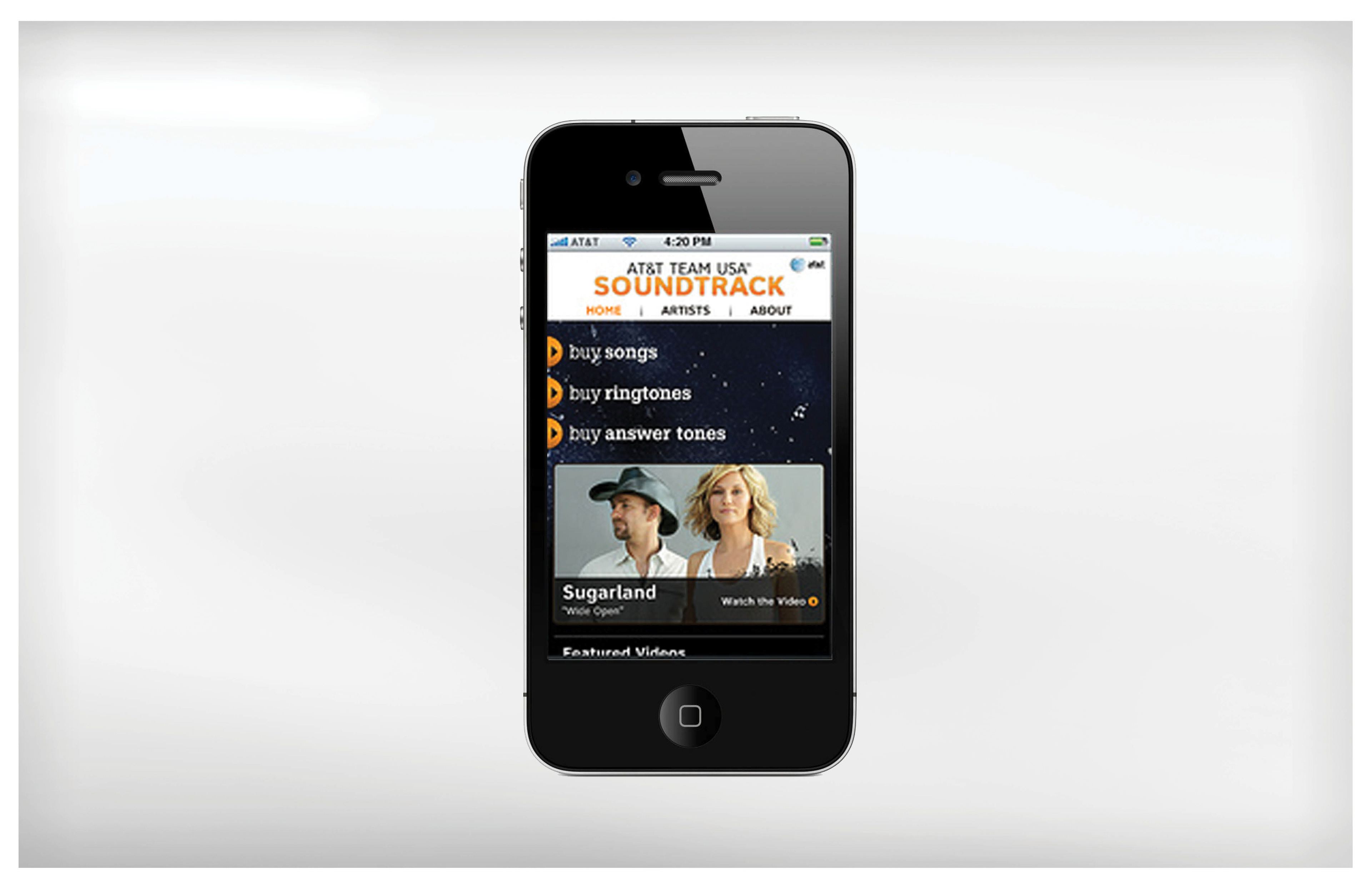AT&T launched the second installment of this program to support the USA athletes in the 2010 Vancouver Winter Olympic Games. The soundtrack consisted of songs written for the games from a wide genre of contemporary artists. With a variety of media - print, digital, OOH and viral consumers were driven to download the songs, ringtones and answer tones through AT&T's Olympic website, mobile site or iTunes. The program generated more than $360,000 in proceeds for Team USA. Whether or not Shaun White actually listened to and was inspired by 3 Doors Down or Sugerland is still up for debate.